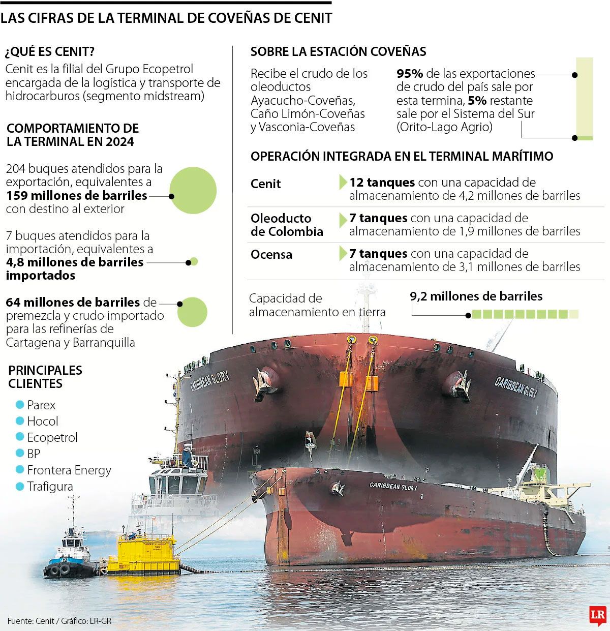 En cuanto a los clientes de la terminal, figuran compañías como Parex, Ecopetrol, Frontera Energy, Trafigura, Hocol y BP; Cenit se apalanca de Ocensa, Oleoducto de Colombia y ODL, plataformas de transporte de crudo entre los campos petroleros, las refinerías de Cartagena y Barrancabermeja y el punto de exportación ubicado en Sucre.